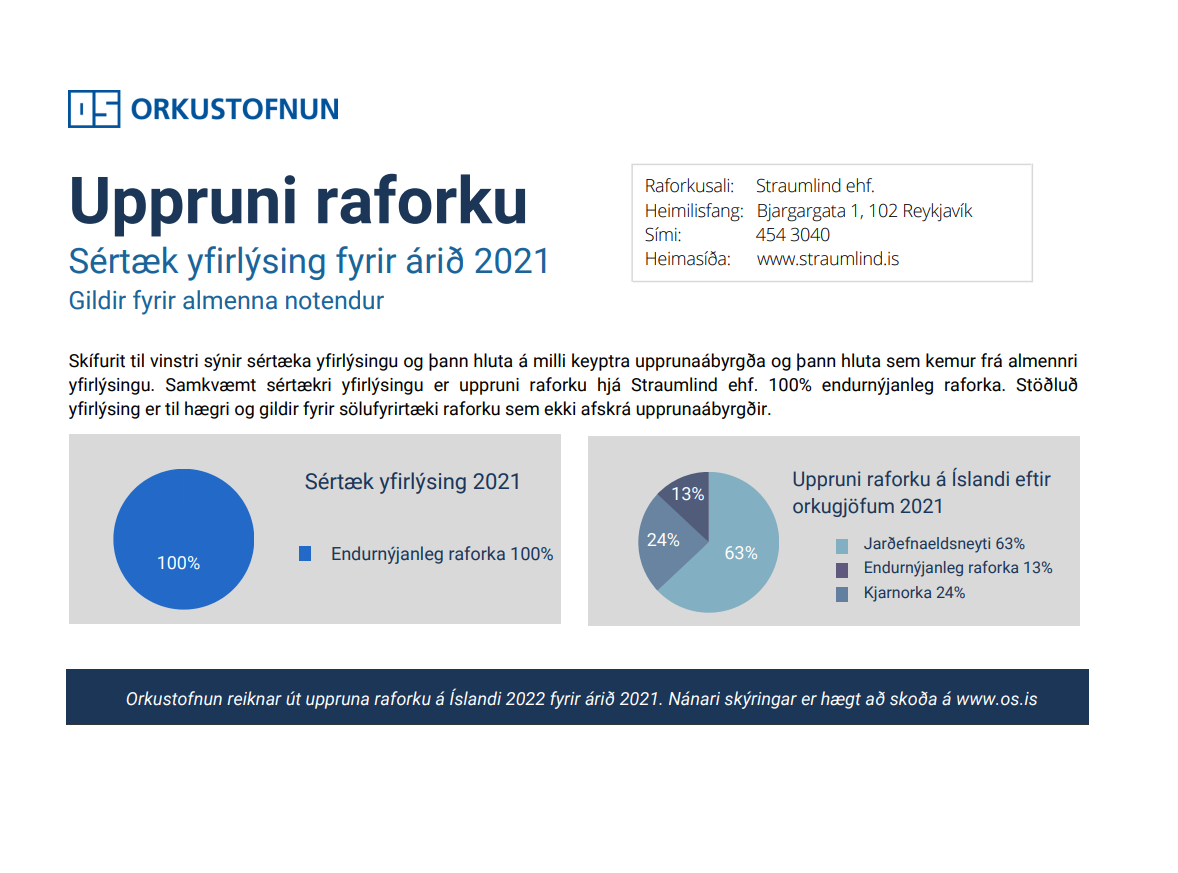 Orkustofnun (The National Energy Agency) has issued a guarantee of renewable origin for the year 2021 that confirms that the origin of electricity from Straumlind is 100% renewable energy.
