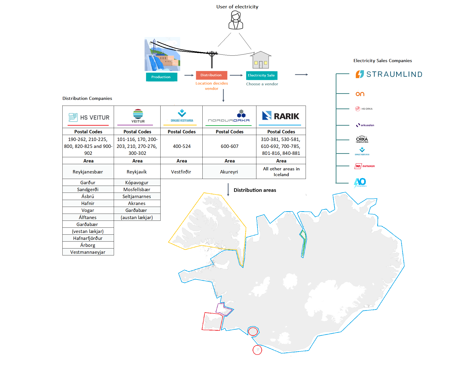 A Distribution Company: There are five distribution companies in Iceland and each of them has a designated area where they manage the distribution of electricity. The Distribution Company is responsible for all equipment related to the delivery of the electricity, e.g. the meter. A user cannot choose which Distribution Company he/she/they are in business with.